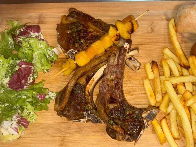 Trois Côtes de Mouton grillées, brochette d'ananas et sauce Karukera