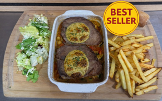 Camembert cuit au Four, rôti de cochon et légumes méridionaux au Miel, salade et frites et sauce tartare