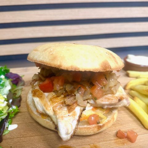Le Burger spécial: Coleslaw, Pulpes de tomates fraîches, fromage de chèvre et miel, filet de poulet, salade et frites