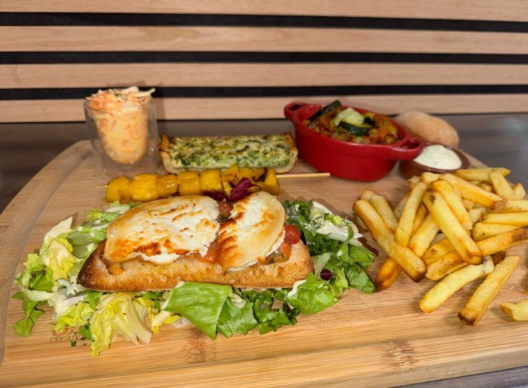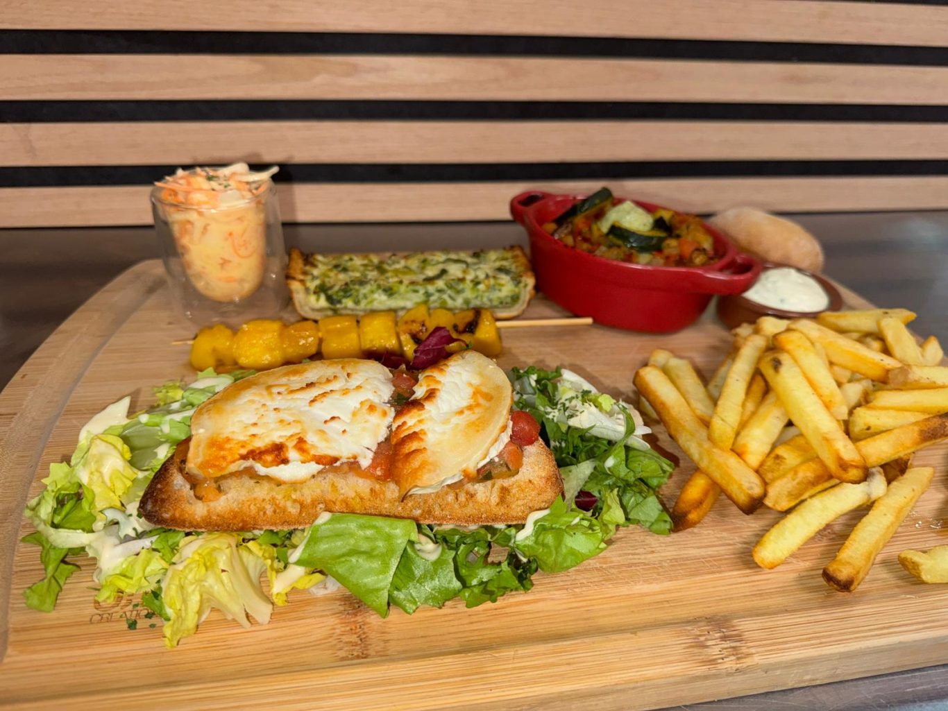 Toast de chèvre chaud au miel, galette de légumes, ratatouille, tartare de tomates, verrine coleslaw, salade frites et sauce tartare, brochette ananas