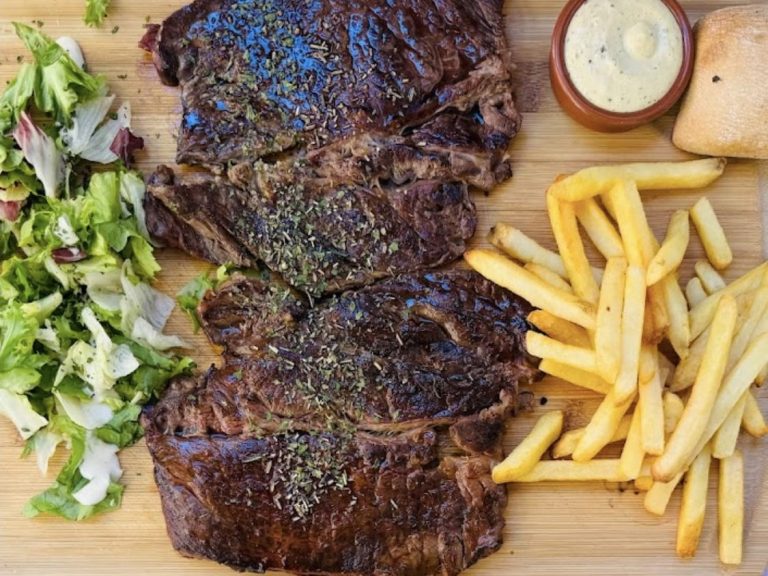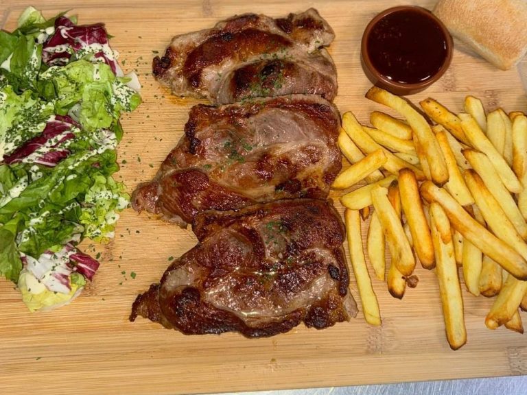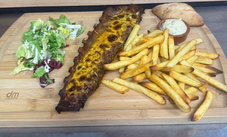 Ribs de porc grillé 450grs, sauce mangusta gratinée au four, salade et frites et sauce tartare