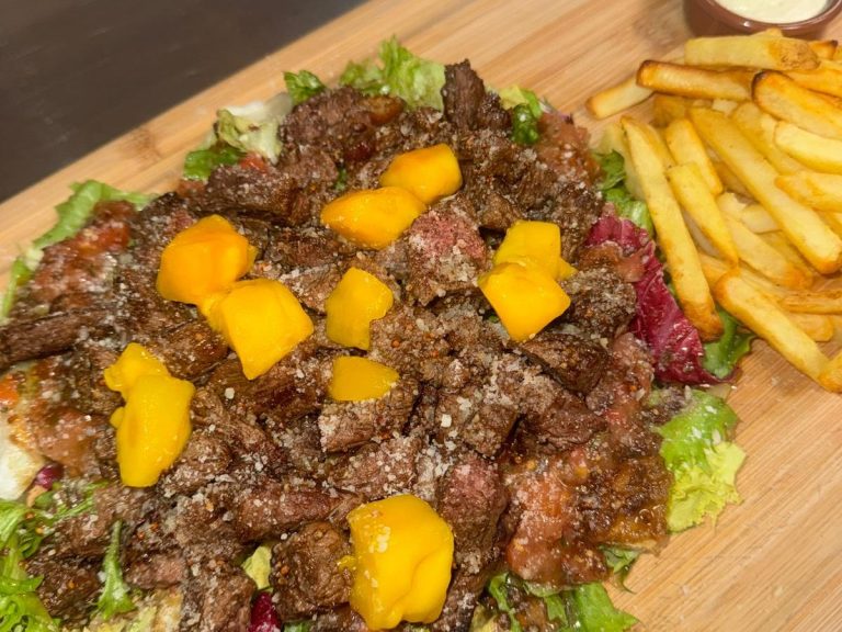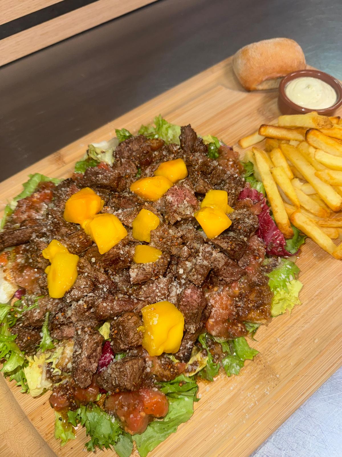 Grande salade de bœuf grillé, tartare de tomates, ananas, parmesan croûtons maison, sauce balsamique aillée, frites et sauce tartare.