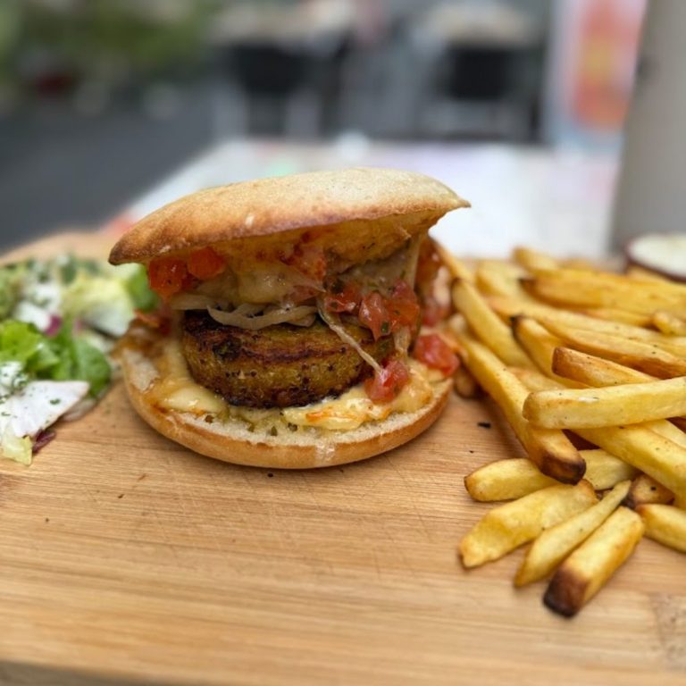 Le Burger Veggie: Coleslaw, Pulpes de tomates fraîches, Galettes légumes quinoa boulghour, emmental salade et frites