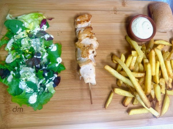 Une double Brochettes de poulet ou Une double brochettes mix de boeuf et poulet, épicées et parfumées aux herbes, sauce chimichuri crêmeuse maison, salade et frites