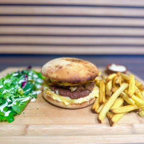 Le Burger savoureux: Coleslaw, Pulpes de tomates fraîches, double Steaks 180gr 100% français, camembert, salade et frites